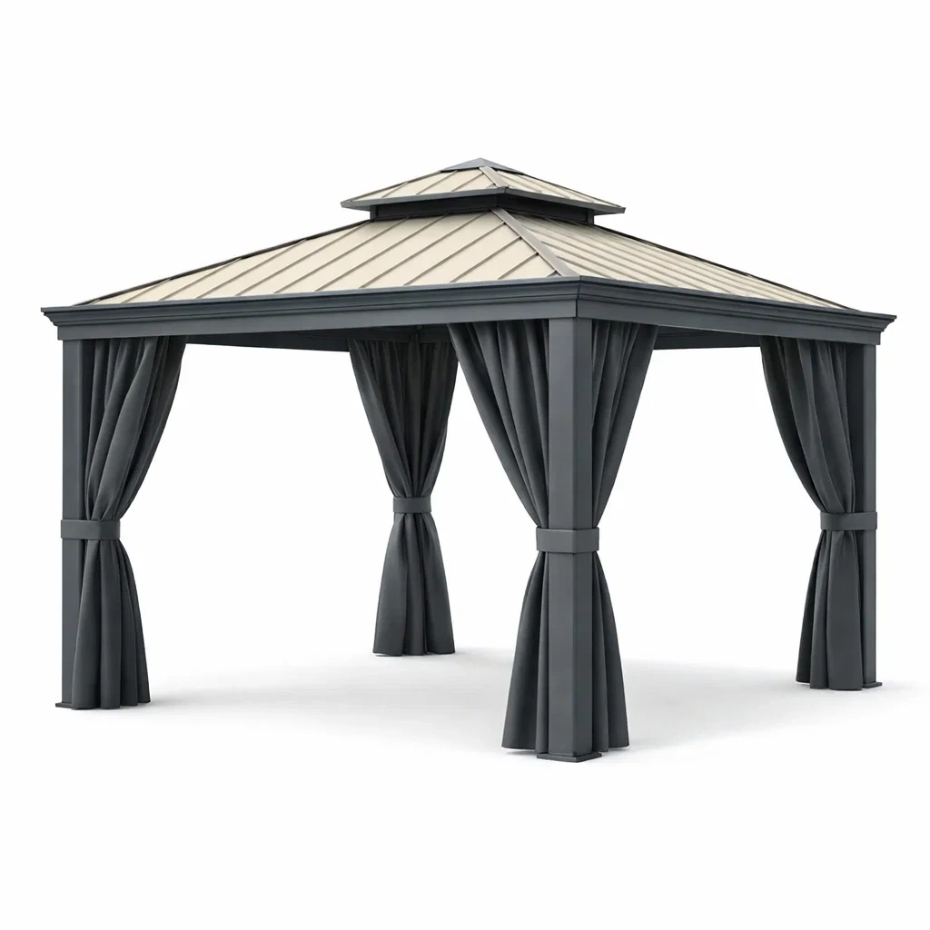 Pavillon aus aluminium mit vorhängen schwarz beige